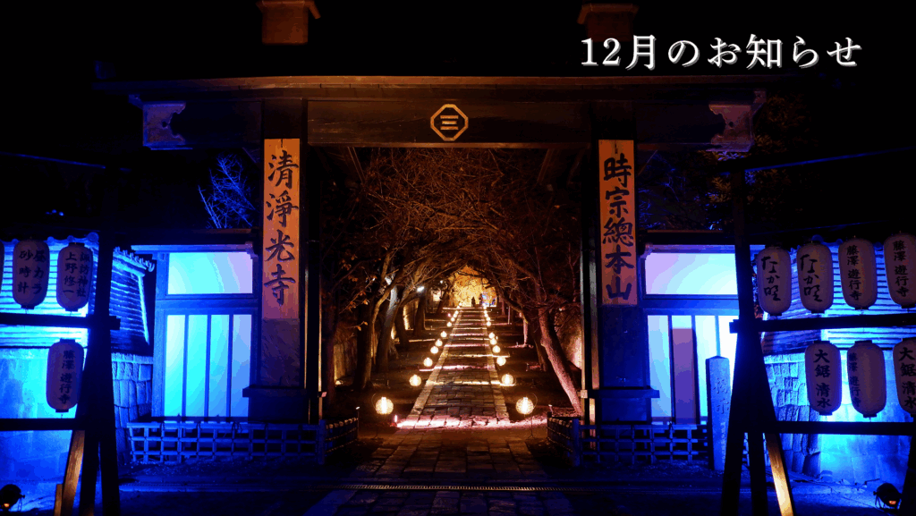 12月は、昨年からスタートした遊行寺ライトアップ「遊行の光」を開催致します。ご家族皆様でご参堂の上、幻想的な光の空間をお楽しみ下さい。