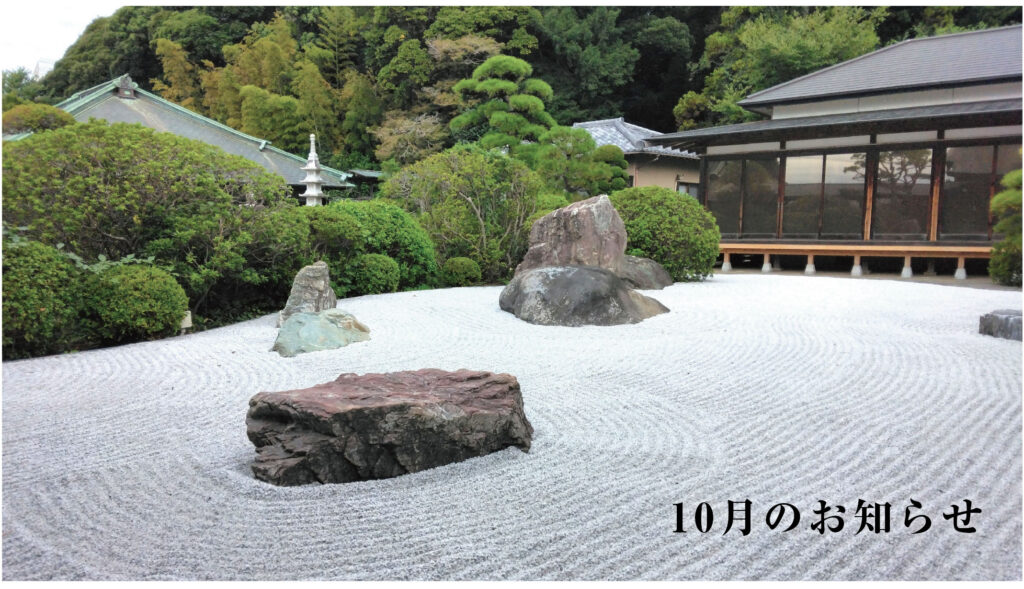 酷暑続きで日中に外に出ることを敬遠しておりましたが、ようやく秋らしい陽気となり、境内を散策すると心地よい秋風が気持ちよく感じられます。今月は檀信徒に向けた研修会をはじめ、横浜能楽堂主催の公演会への参加を予定しております。様々な行事を通して、仏教を感じる機会となればと思いますので、ぜひご参加をお待ちしております。